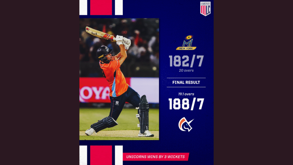 Xavier Bartlett’s blazing unbeaten 25-ball 59 powered San Francisco Unicorns to a stunning 3-wicket win over MI New York in